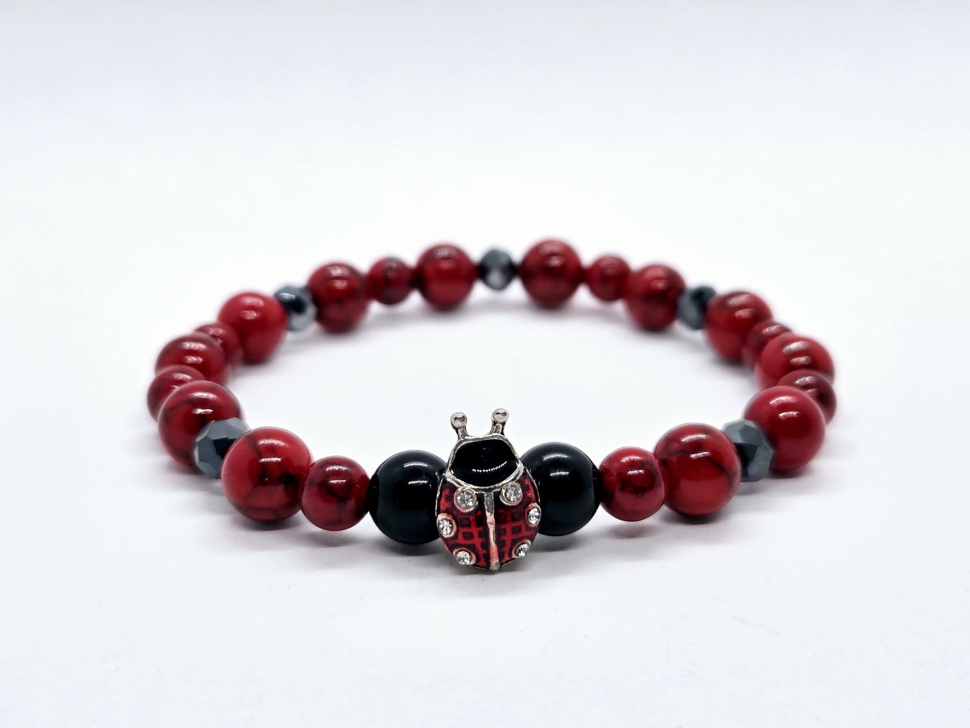 Bracelet Coccinelle en Howlite Rouge et Agate Noire – Élégance et Symbolisme