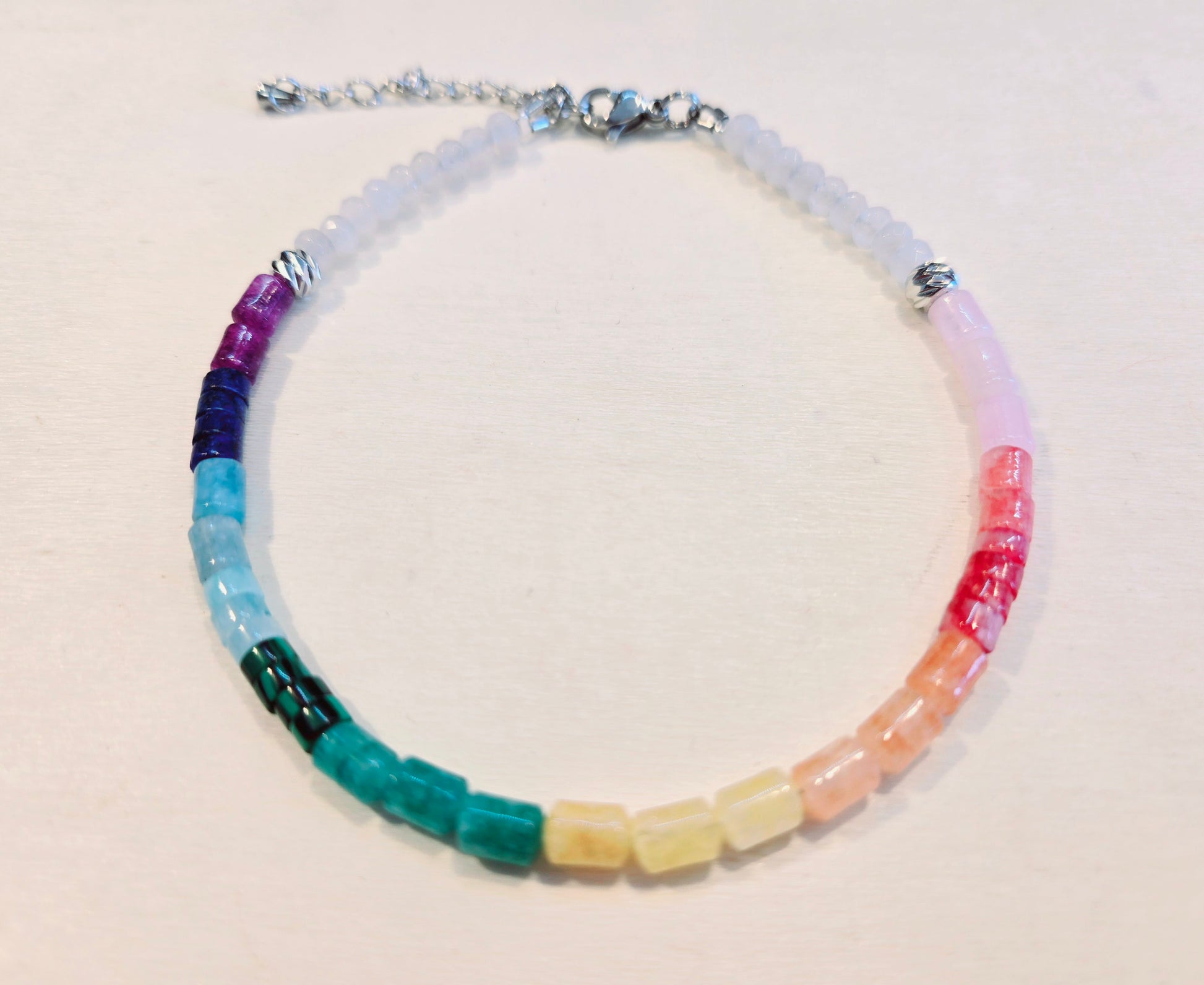 Composé de perles de jade, quartz, améthyste, Lapis-Lazuli, Aigue-Marine, malachite et calcédoine.