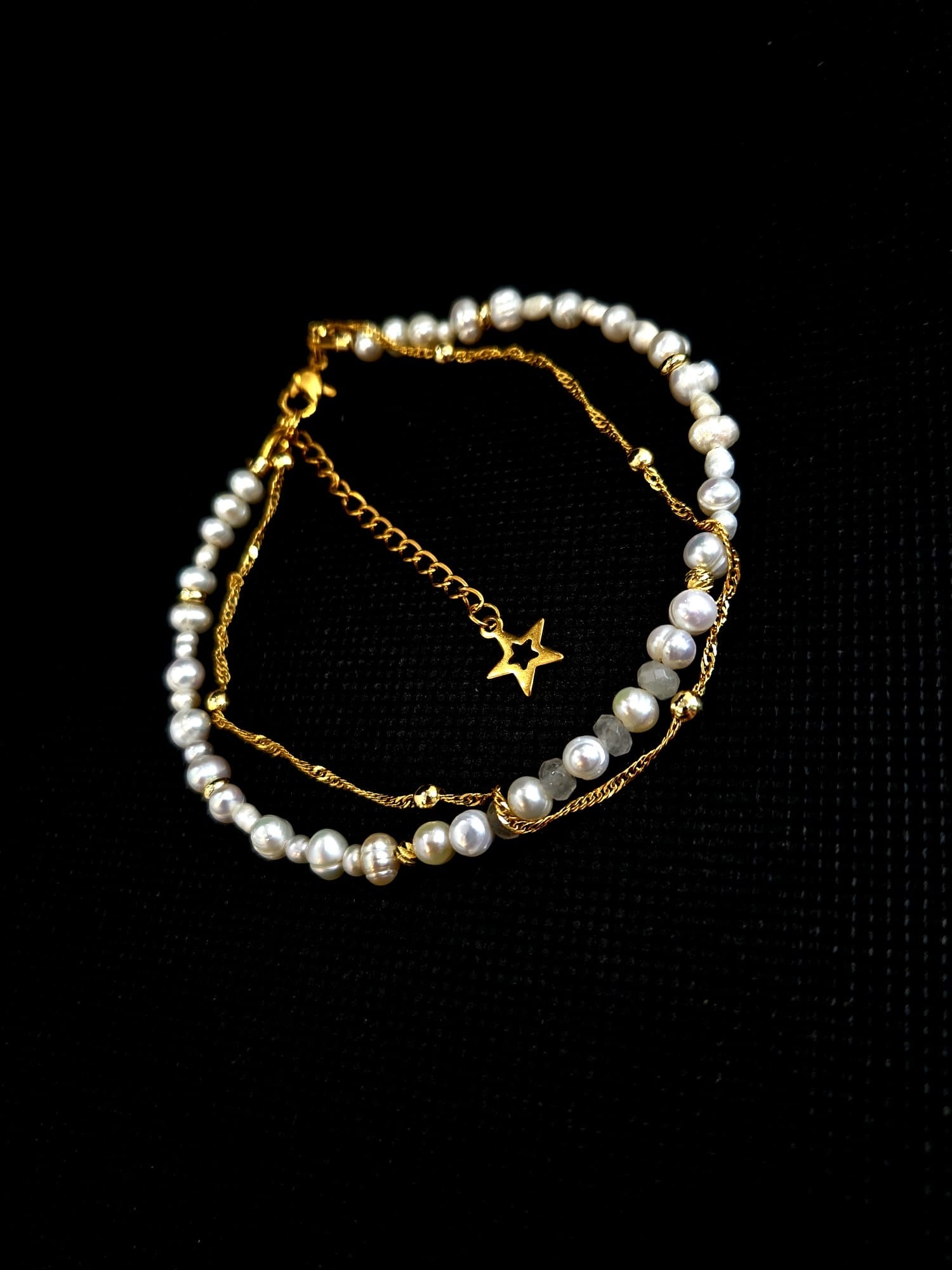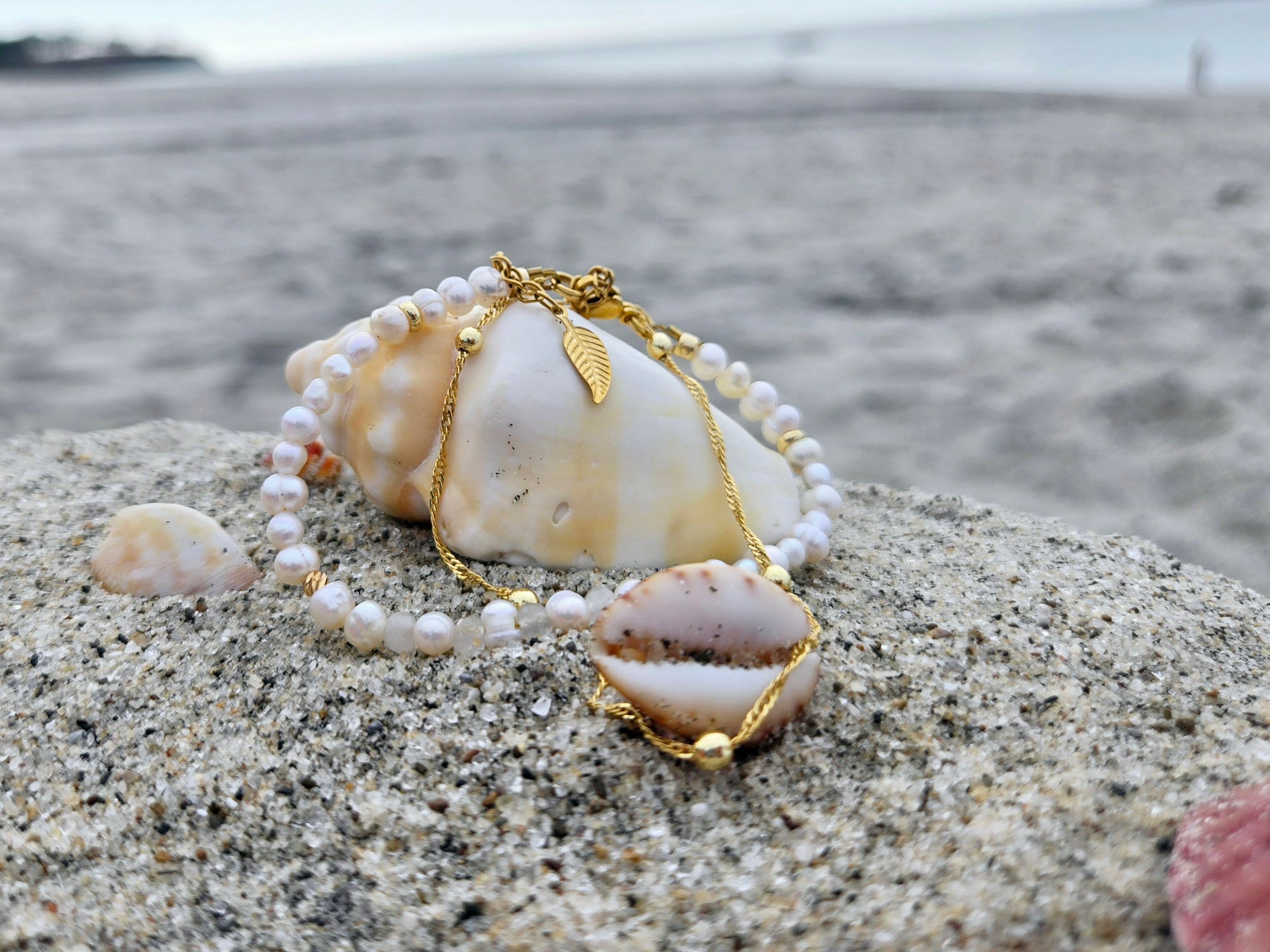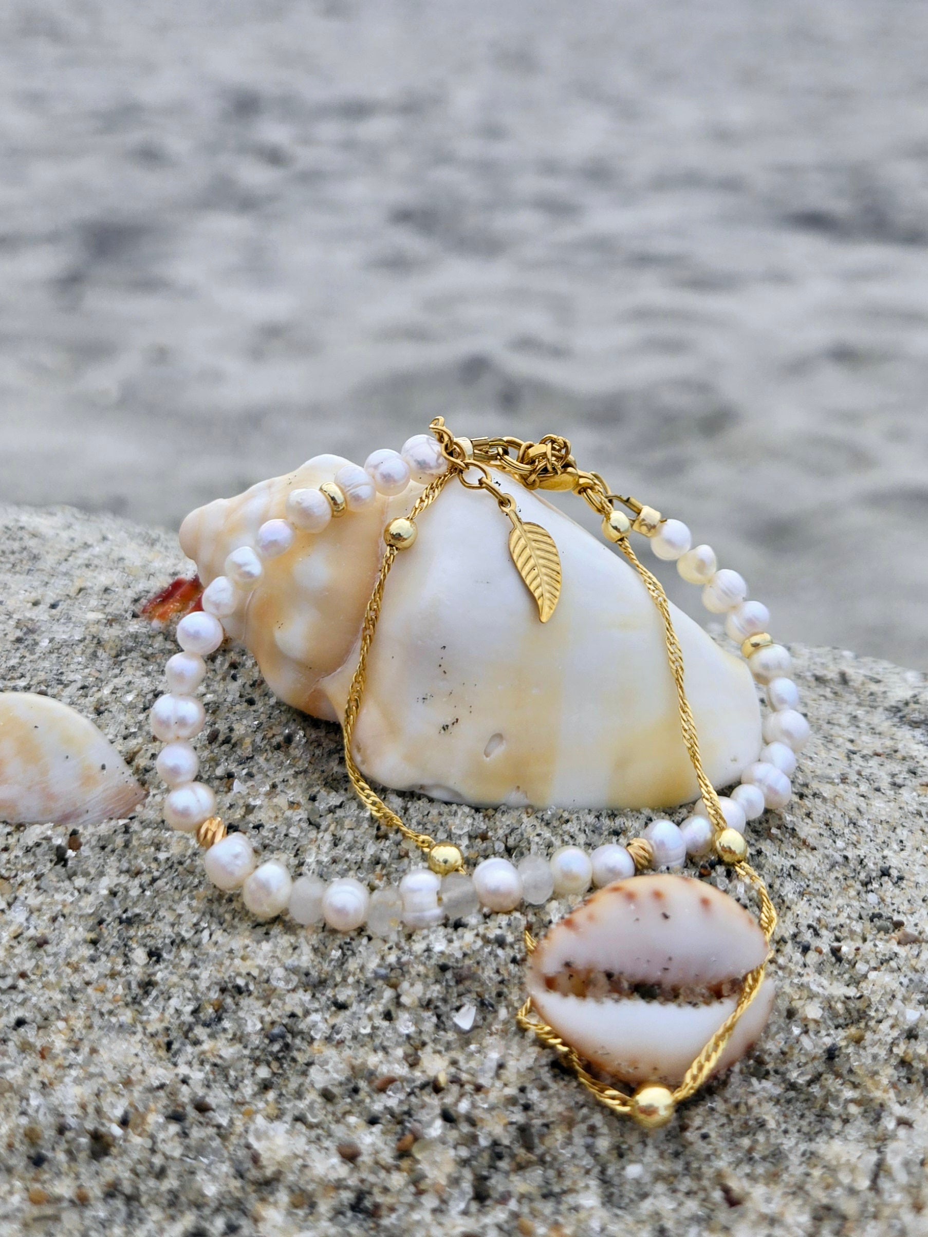 Découvrez notre bracelet en perles d’eau douce, sublimé par un bracelet d’or en acier inoxydable. Son fermoir en acier assure une tenue parfaite, tandis que l’éclat délicat des perles apporte une touche de sophistication intemporelle.