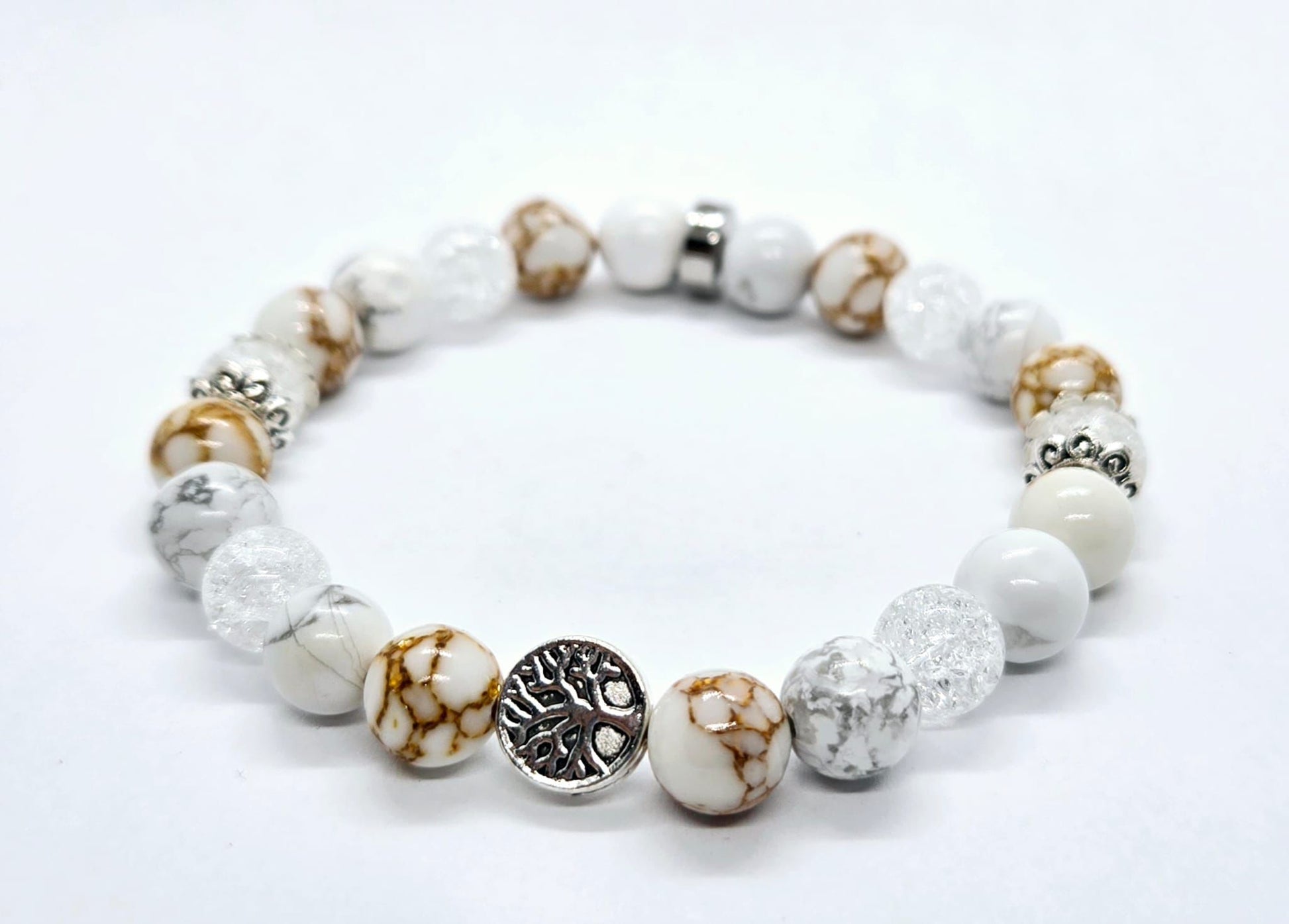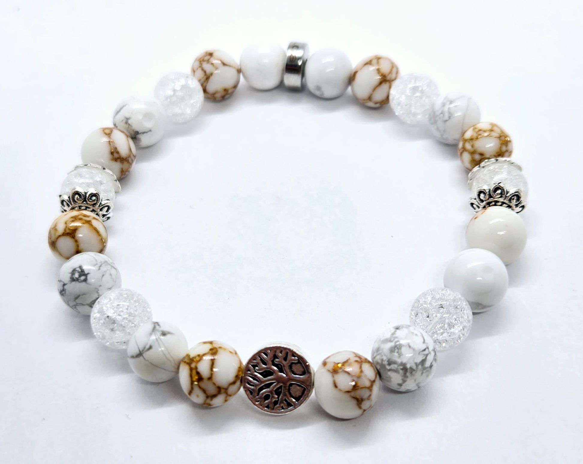 Ce bracelet élégant en argent et pierres précieuses est orné d'un magnifique arbre sculpté en relief. La pierre de howlite dorée procure une sensation de bien-être et la pierre de howlite apporte la sérénité. Parfait pour ajouter une touche de sophistication à votre tenue.