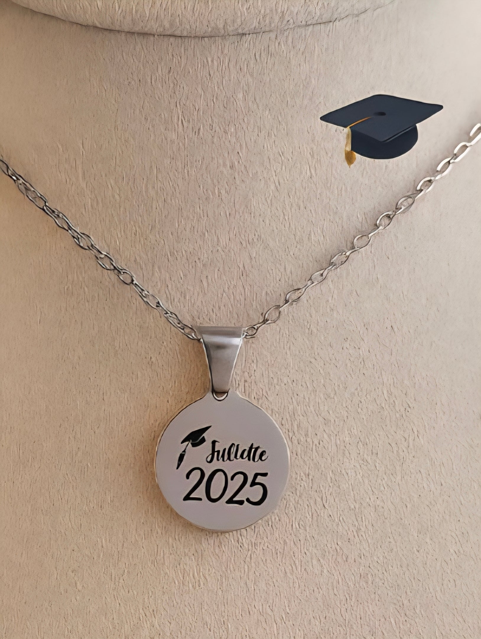 Chaine de 45 cm et médaille de 15 cm en acier inoxydable.