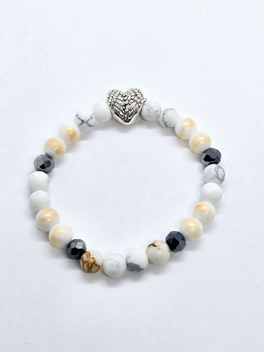 Prix habituel $18.00 CADPrix habituelPrix unitaire parPrix soldé $18.00 CADCe bracelet enfant arbore un adorable coeur. Il est composé de perles de pierres naturelles de howlite et d'hématite. Taille: 6,5 Inch Fabriqué artisanale au Québec. De plus, pour chaque... -