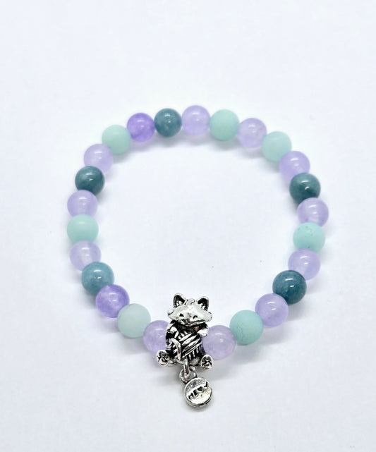 Prix habituel $18.00 CADPrix habituelPrix unitaire parPrix soldé $18.00 CADCe bracelet enfant arbore un adorable chat. Composé de perles de pierres naturelles d'amazonite, de jade et d' aigue-marine. Taille: 6,5 Inch Fabriqué artisanale au Québec. De plus, pour chaque... -