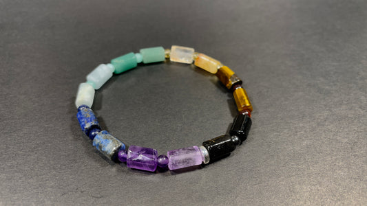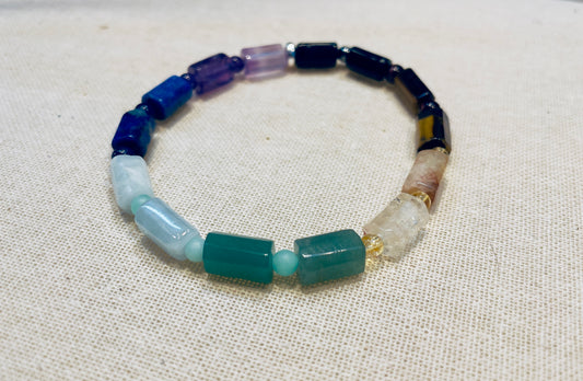 Prix habituel $24.00 CADPrix habituelPrix unitaire parPrix soldé $24.00 CADBracelet en perles de pierre naturelles de taille 7,5 inch, 19 cm. Il est composé de perles de tourmaline, oeil de tigre, citrine, aventurine, aigue-marine, lapis-lazuli et améthyste. -