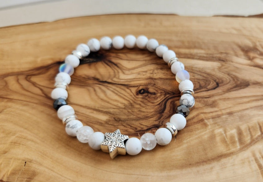 "Enhance your outfit with our star bracelet made of hematite stones and white howlite."