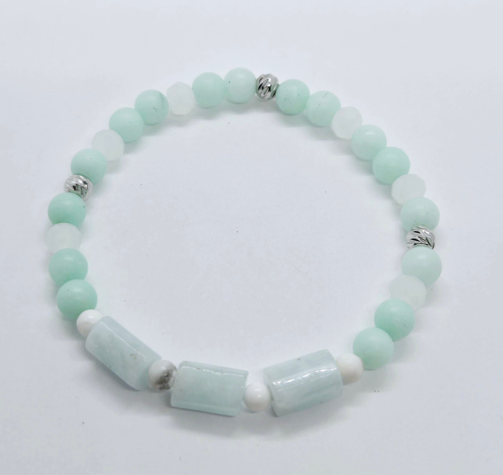 This glacier bracelet is made with aquamarine, amazonite, and howlite stones, known for their soothing and balancing properties. Reduce stress and increase mental clarity while adding a touch of style to your look. Ideal for people seeking to find balance and tranquility in their lives.