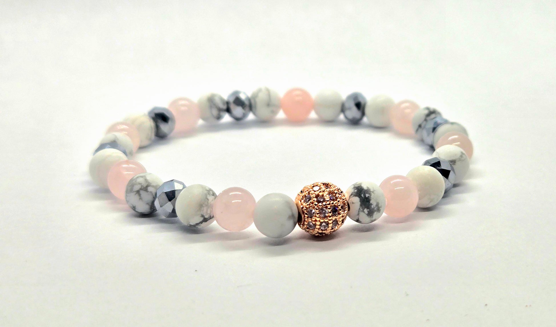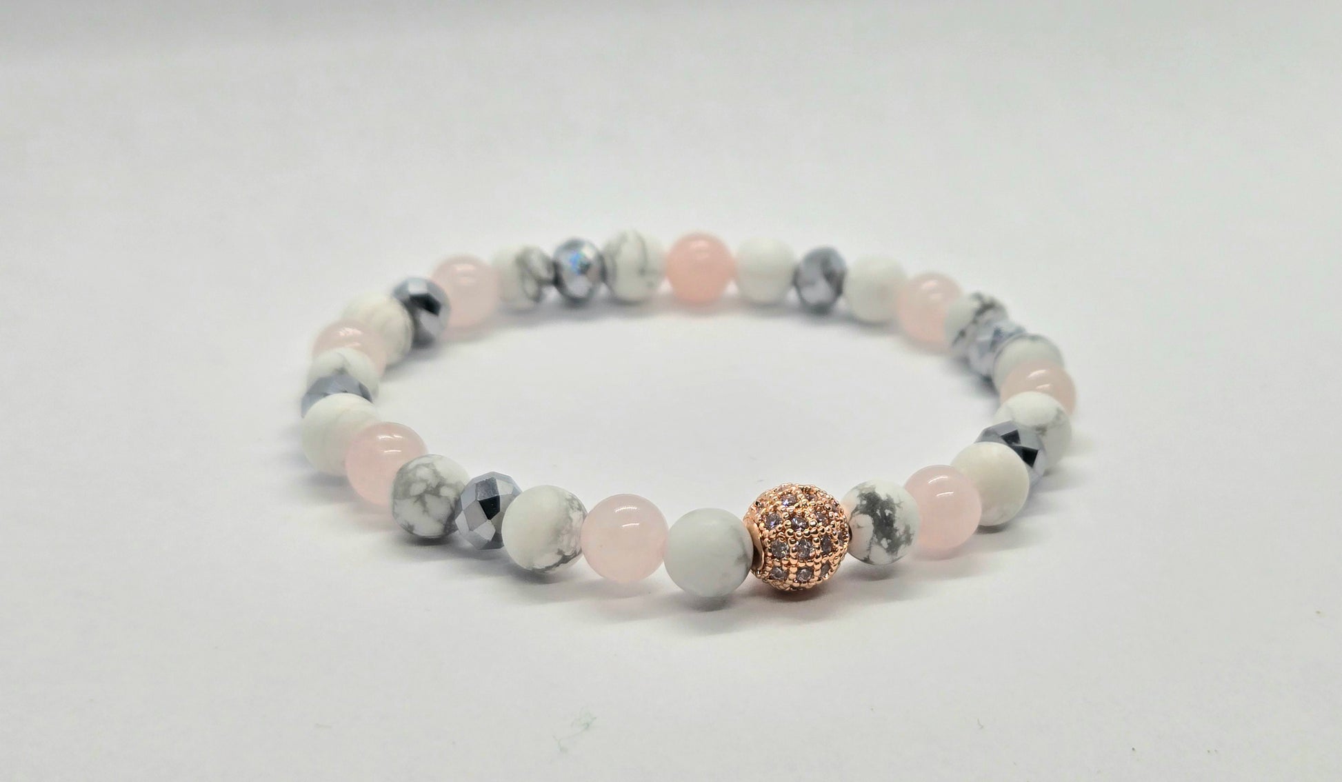 Composed of natural rose quartz and howlite beads, it embodies elegance and quality.
