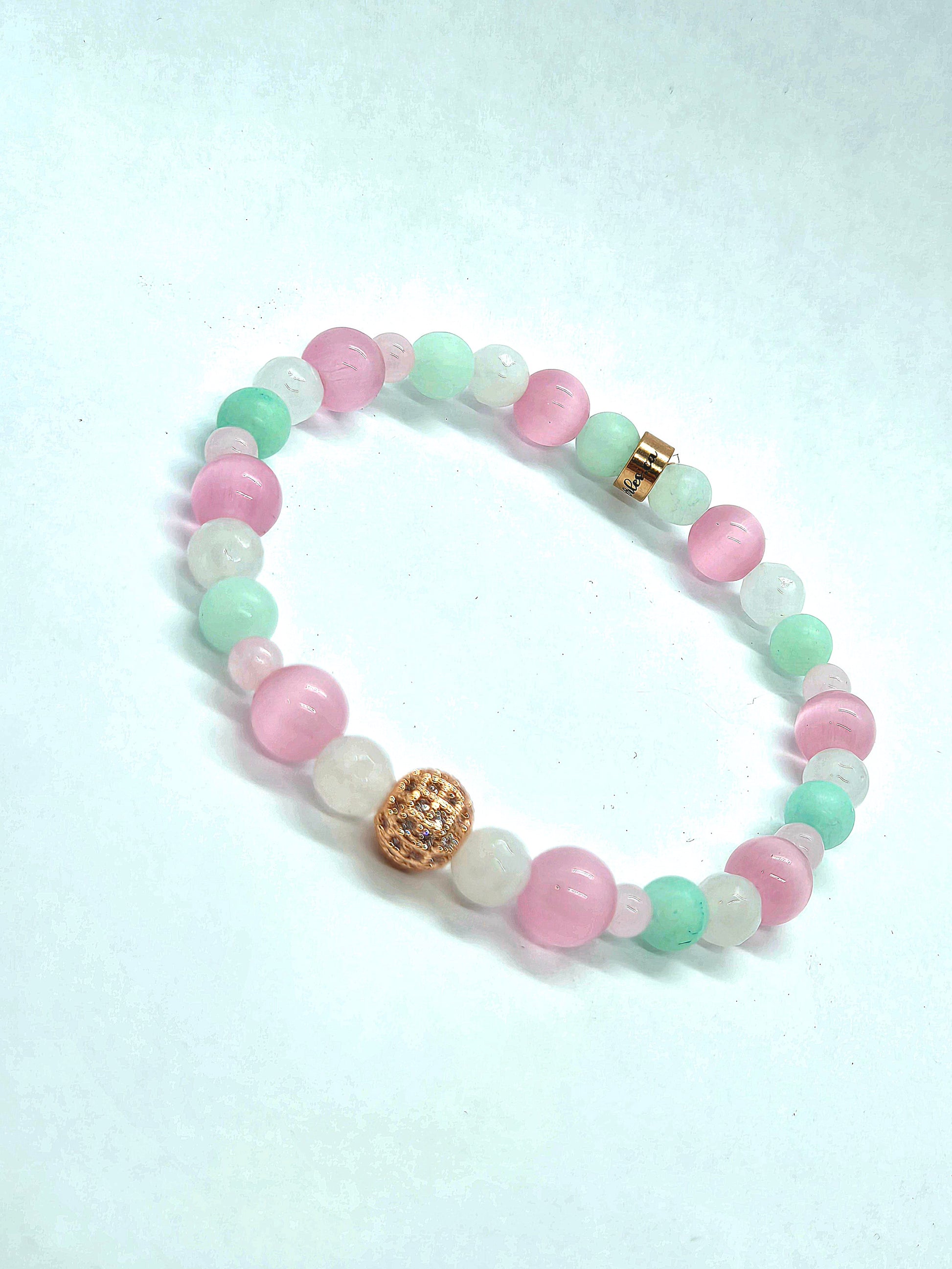 It is made of cat's eye beads, amazonite, quartz, and jade.