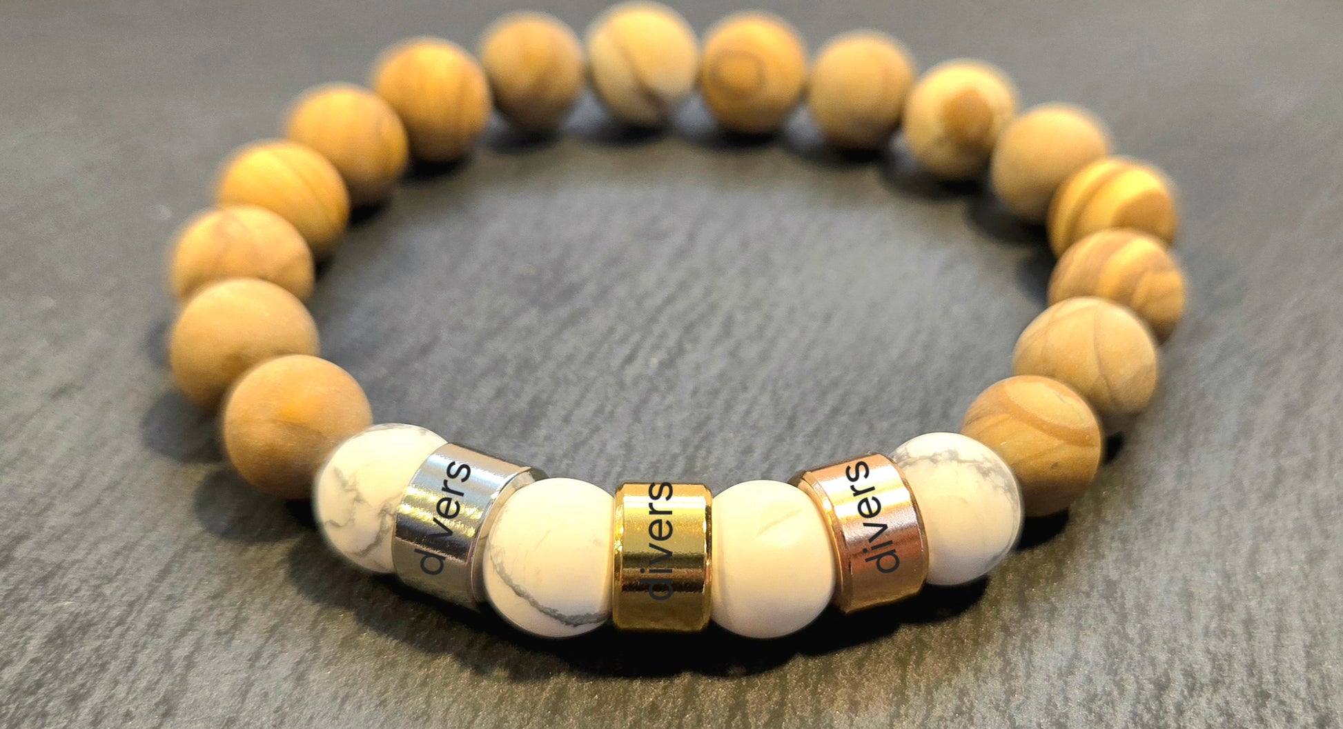 Enjoy a 21 cm bracelet with jasper and howlite beads.