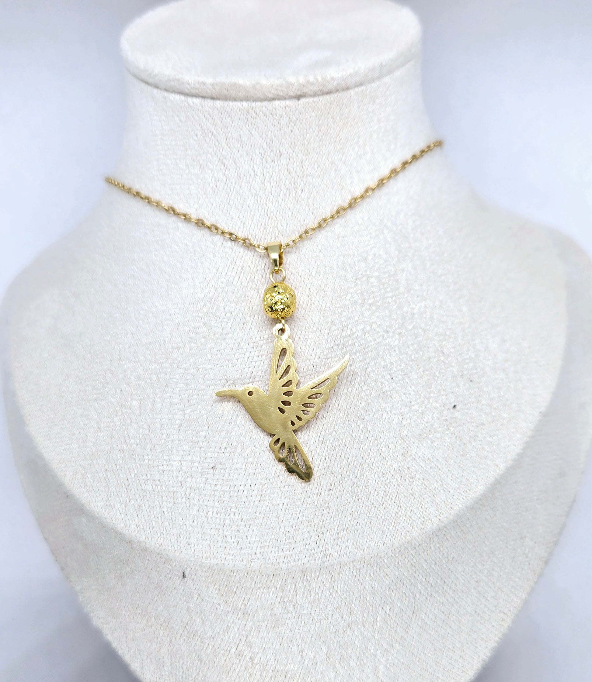 "Treat yourself to this magnificent Colibri necklace made of stainless steel for an elegant and durable style. With its delicate design and shiny finish, it will add a touch of nature to your outfit. Let yourself be charmed by its appeal and exceptional quality. Indulge yourself with this unique piece of jewelry!"