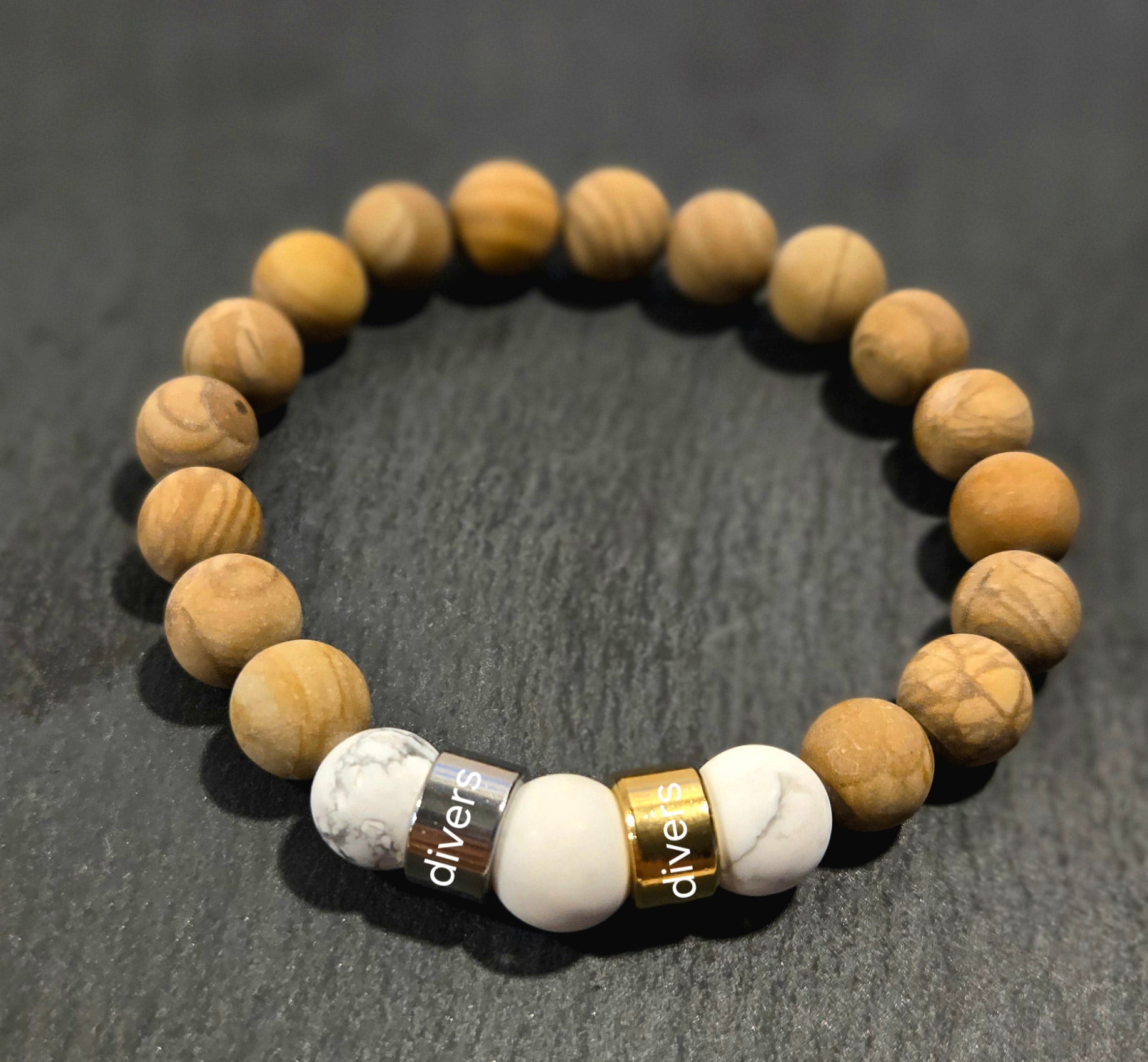 Enjoy a 21 cm bracelet with jasper and howlite beads.