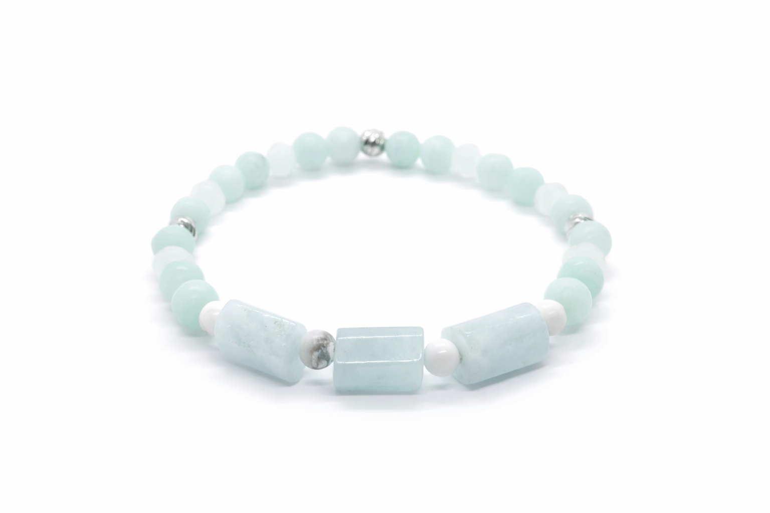 This glacier bracelet is made with aquamarine, amazonite, and howlite stones, known for their soothing and balancing properties. Reduce stress and increase mental clarity while adding a touch of style to your look. Ideal for people seeking to find balance and tranquility in their lives.